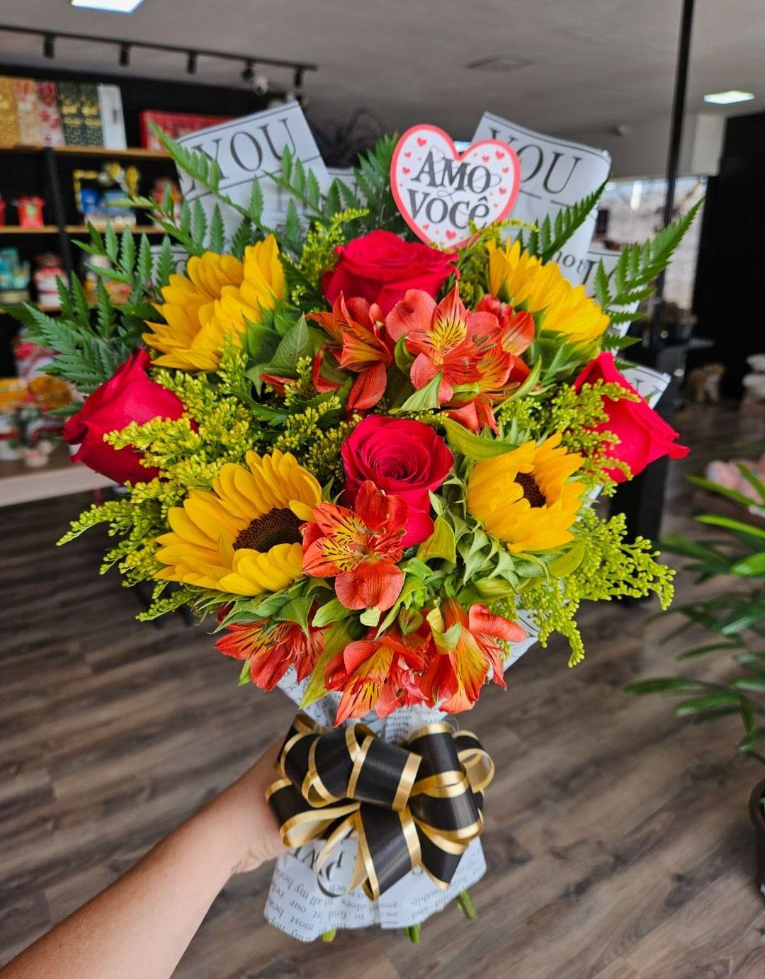 / buquê rosas e girassol